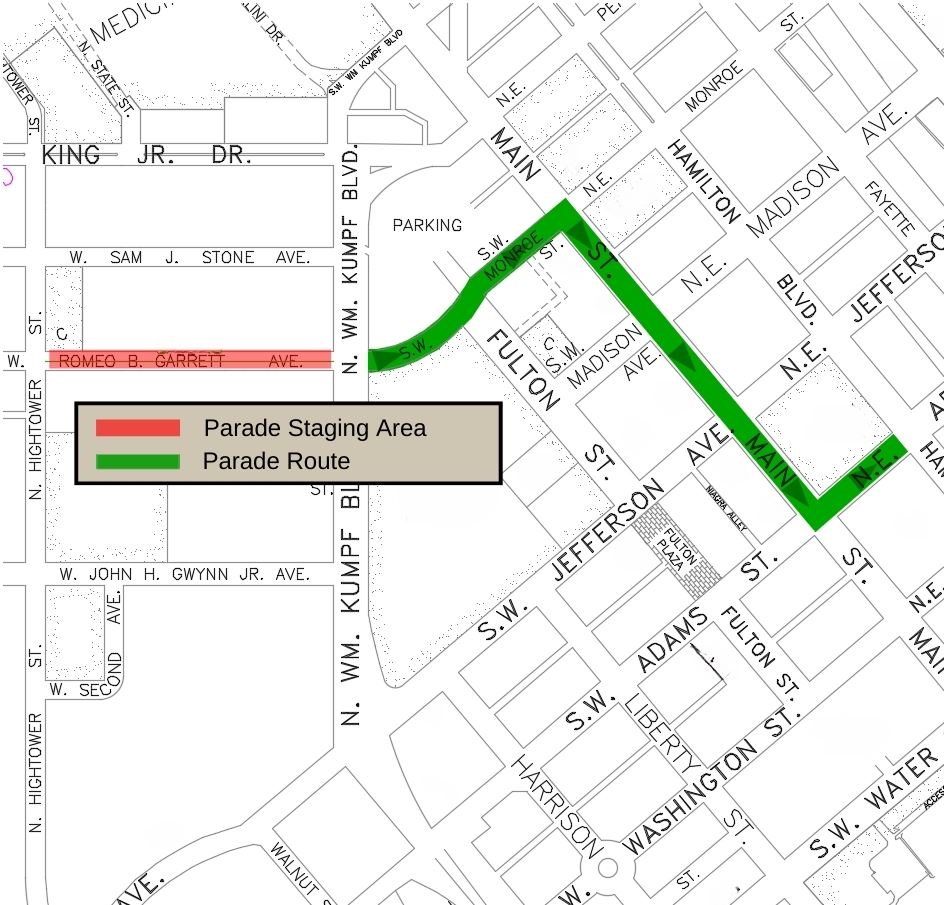 W. Romeo B. Garrett Avenue will be closed between N. Richard Pryor Place and N. William Kumpf Boulevard.